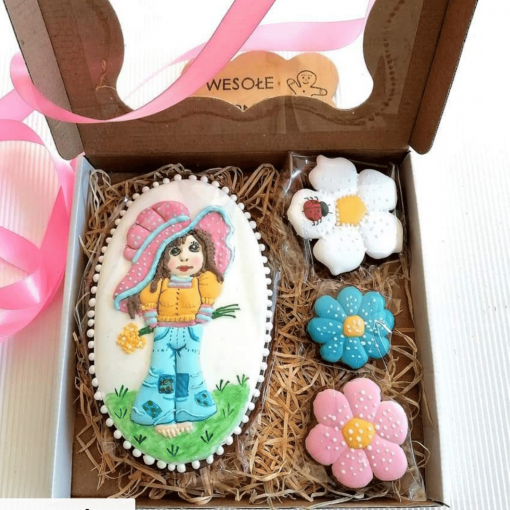 Urocza piernikowa ozdoba w kształcie dziewczynki w zestawie z kwiatkami. Super pomysł na prezent bądź podziękowania.