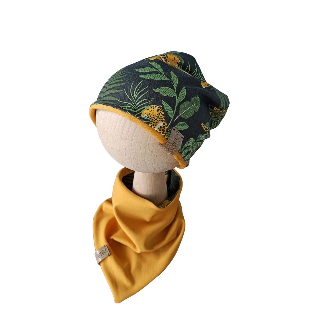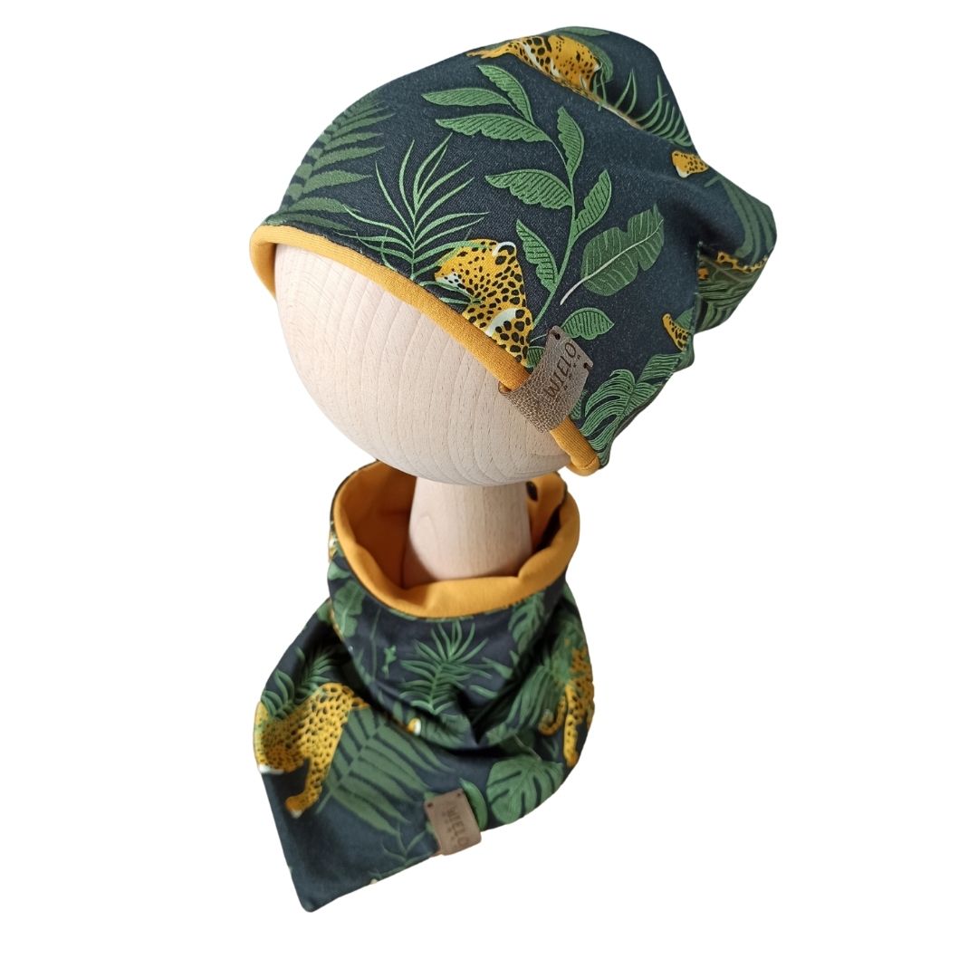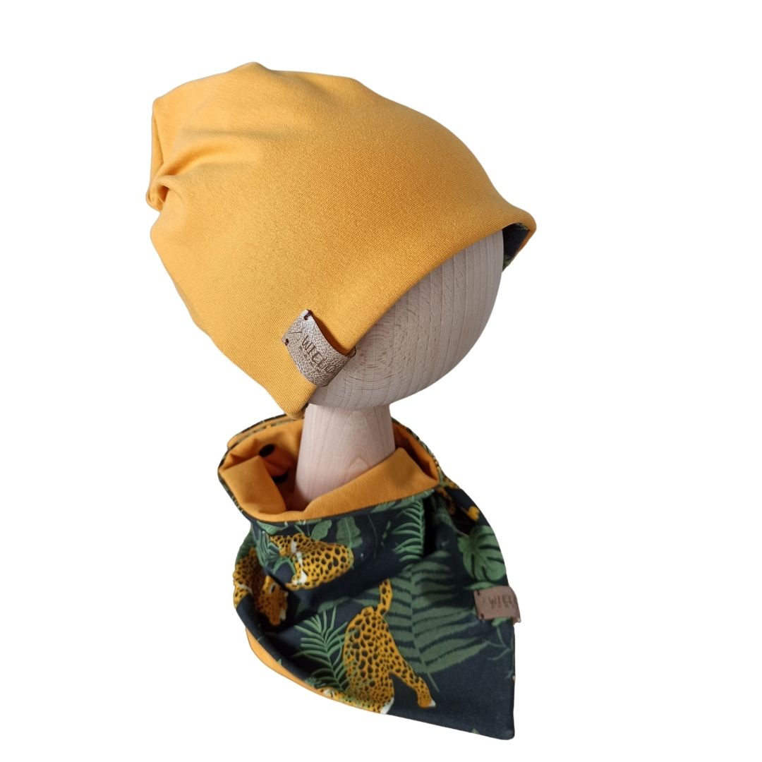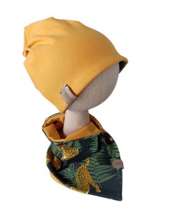 - czapeczka i komin uszyte są z materiału, który posiada certyfikat OEKO-TEX, 94% bawełna, 6% elastan,