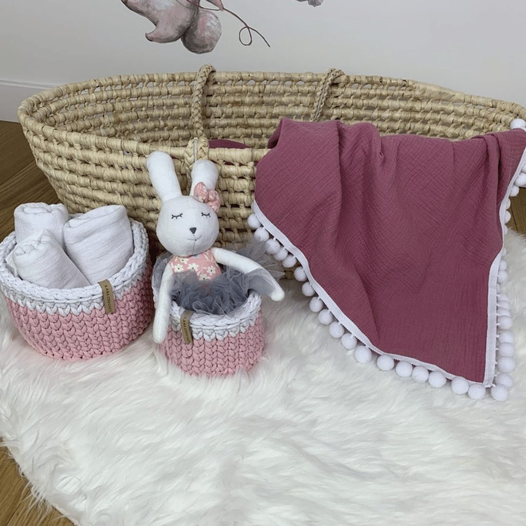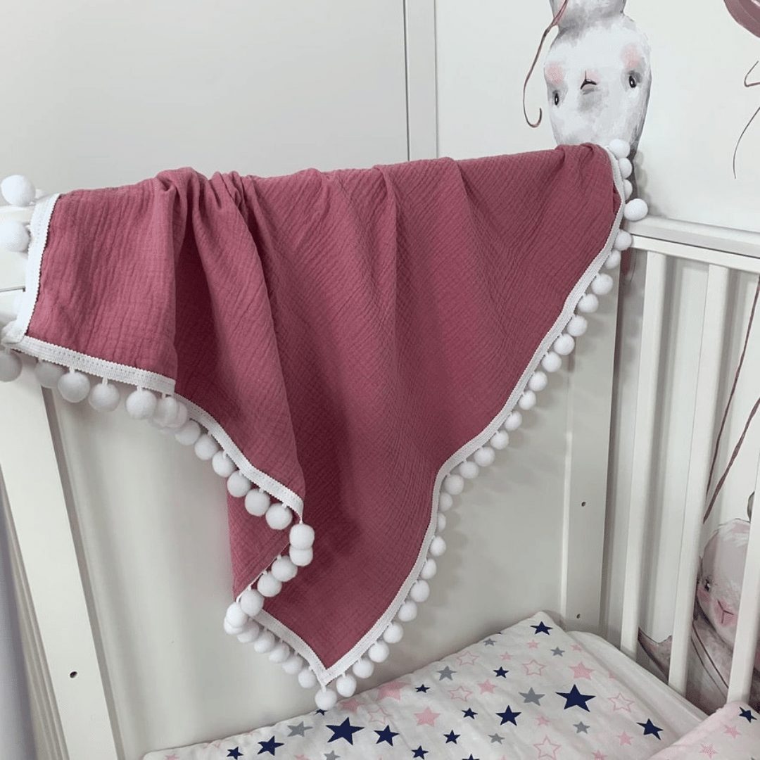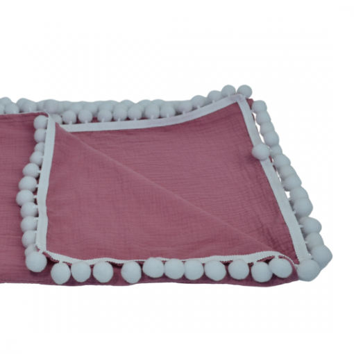 Uroczy kocyk z pomponikami ręcznie uszyty z muślinu Double Gaze, który jest wysokiej jakości tkaniną, posiadającą w składzie 100% bawełny. Bardzo miękki i przede wszystkim naturalny materiał został wyprodukowany z myślą o delikatnej skórze maluszka. Świetnie się sprawdzi nie tylko jako kocyk ale także otulacz. Nasze kocyki są z bawełnianego muślinu, który dodatkowo jest bardzo przewiewny.