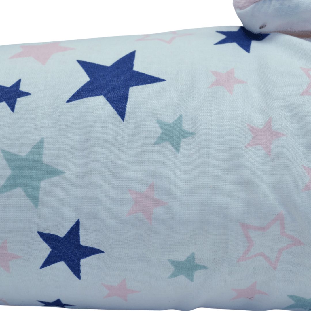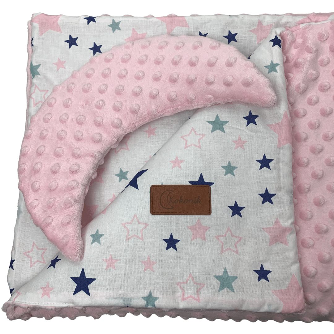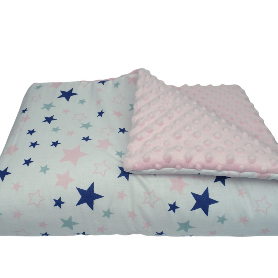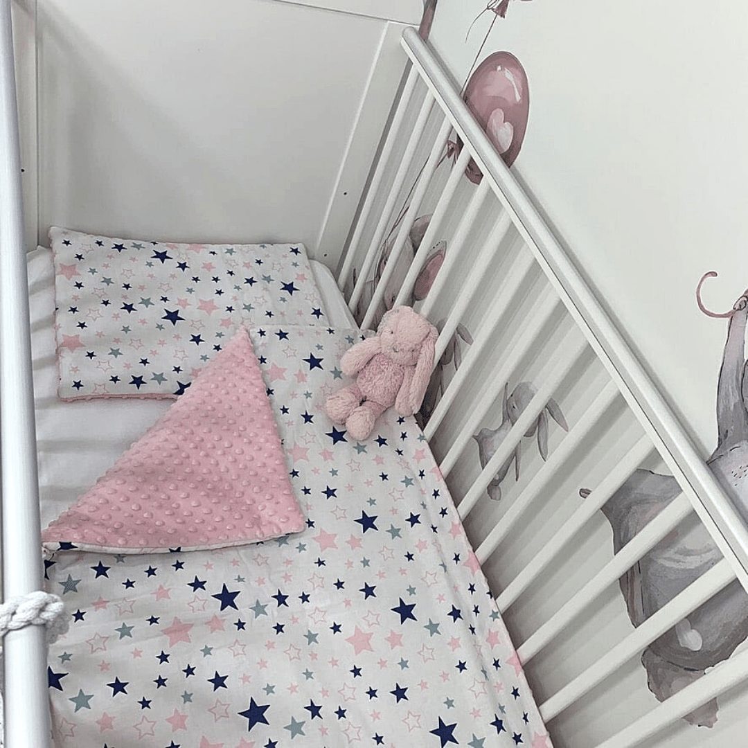 - kolor: bawełna różowe, szare i granatowe gwiazdki i Minky pudrowy róż,