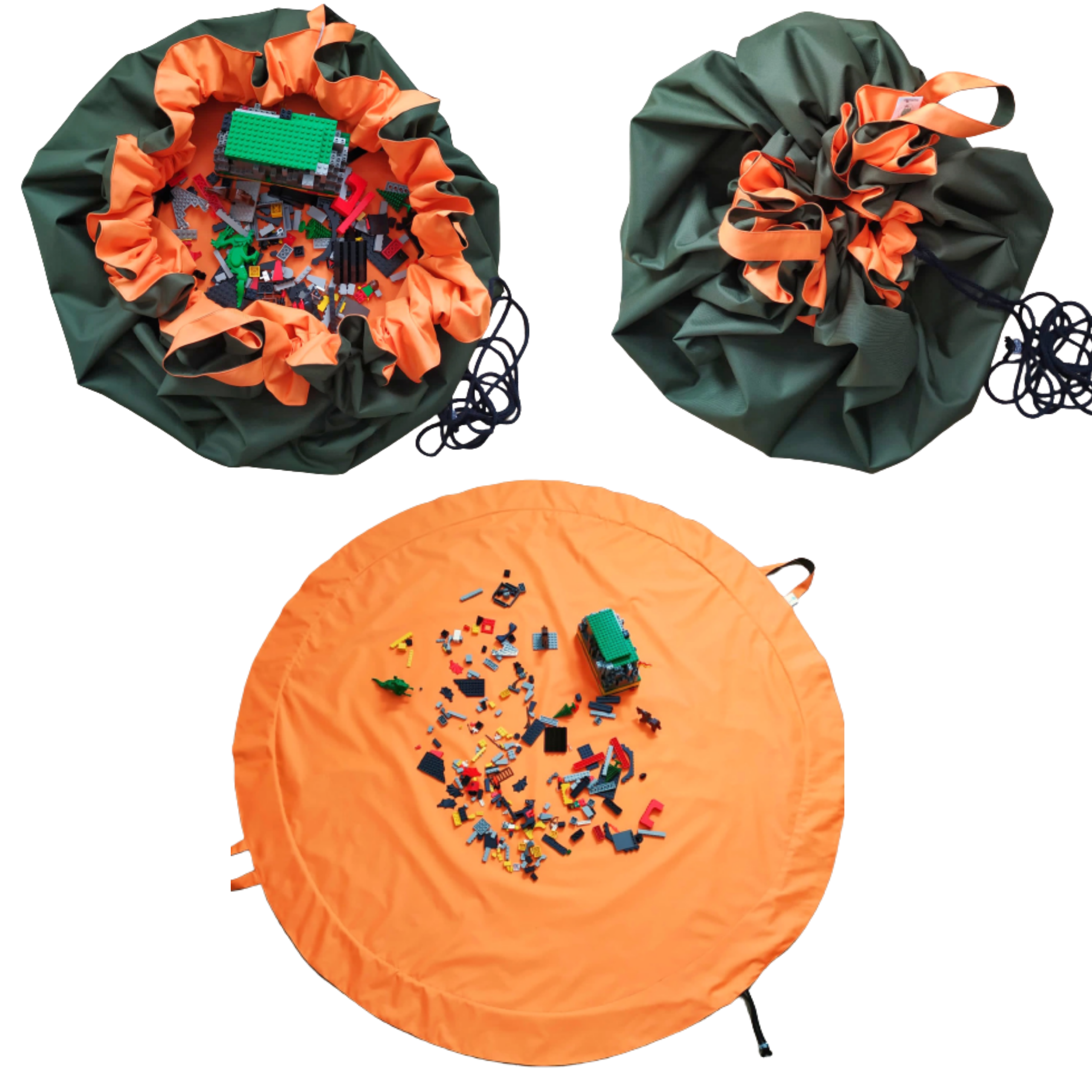 Mata wykonana jest z dwóch warstw trwałego, wodoodpornego materiału, w który wsunięty jest sznurek zakończony plastikowym ściągaczem, dzięki czemu po zabawie wystarczy go ściągnąć wraz z zabawkami i klockami, które znajdują się na macie. W ten sposób powstaje zamknięty worek, który można łatwo przenieść.