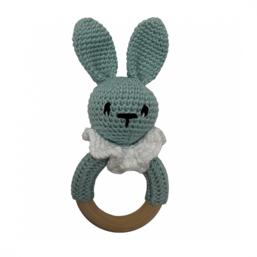 - króliczek został ręcznie wykonany na szydełku z włóczki bawełniano – akrylowej posiadającej certyfikat Oeko-Tex Standard 100, zawiera element grzechoczący oraz wypełniony jest antyalergiczną kulką silikonową.