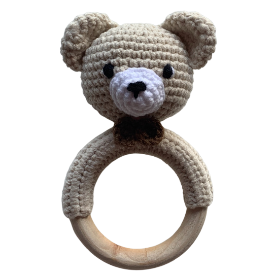 - miś został ręcznie wykonany na szydełku z włóczki bawełniano – akrylowej posiadającej certyfikat Oeko-Tex Standard 100, zawiera element grzechoczący oraz wypełniony jest antyalergiczną kulką silikonową.