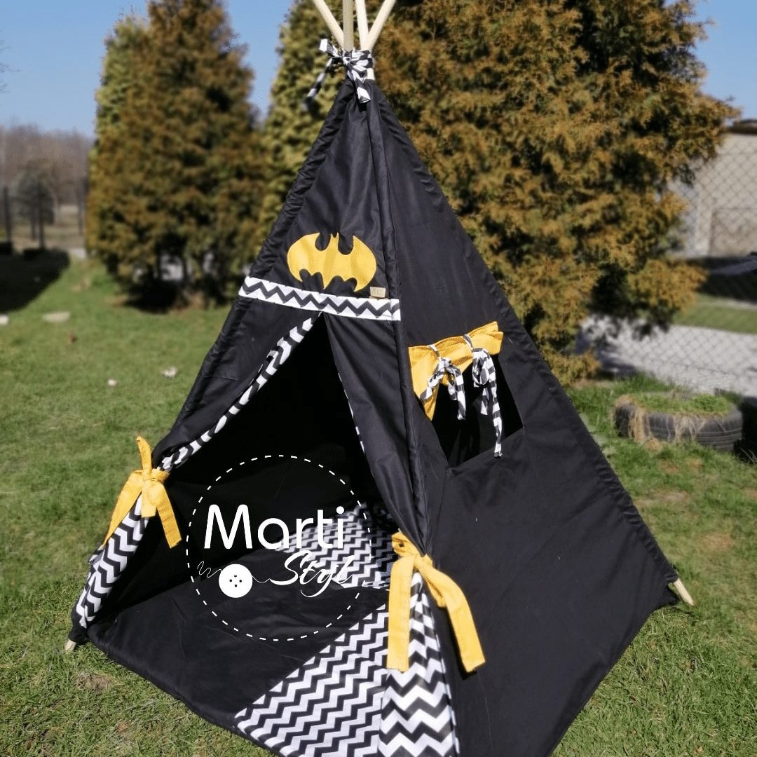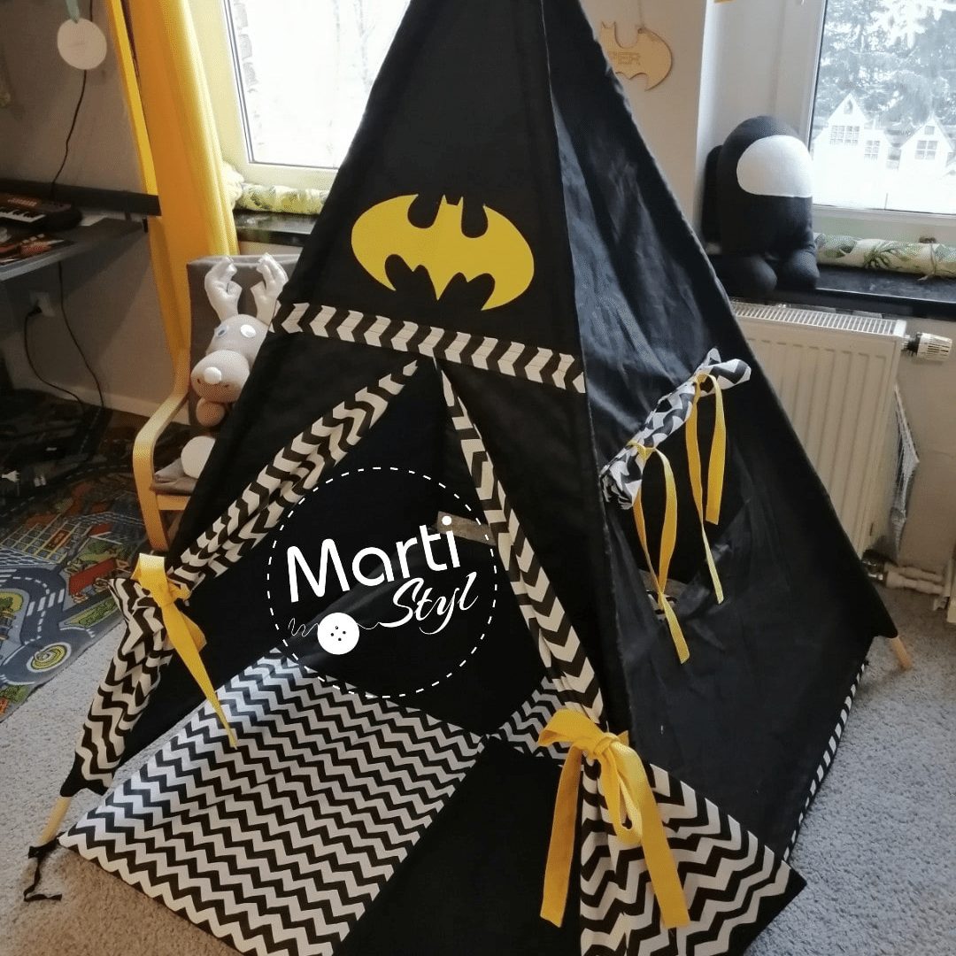 Ręcznie uszyty namiot tipi z motywem Batmana idealnie się sprawdzi jako kryjówka czy baza w pokoju dziecięcym. Tipi przyniesie mnóstwo radości Twojemu dziecku.