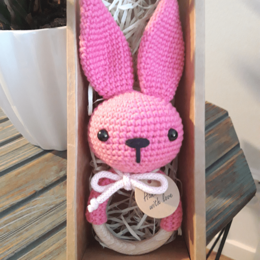 - króliczek został ręcznie wykonany na szydełku z włóczki bawełniano – akrylowej posiadającej certyfikat Oeko-Tex Standard 100, zawiera element grzechoczący oraz wypełniony jest antyalergiczną kulką silikonową.