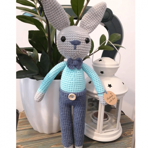 - króliczek został ręcznie wykonany z włóczki bawełniano-akrylowej posiadającej certyfikat Oeko-Tex Standard 100, wypełniony jest antyalergiczną kulką silikonową, oraz posiada bezpieczne oczy.