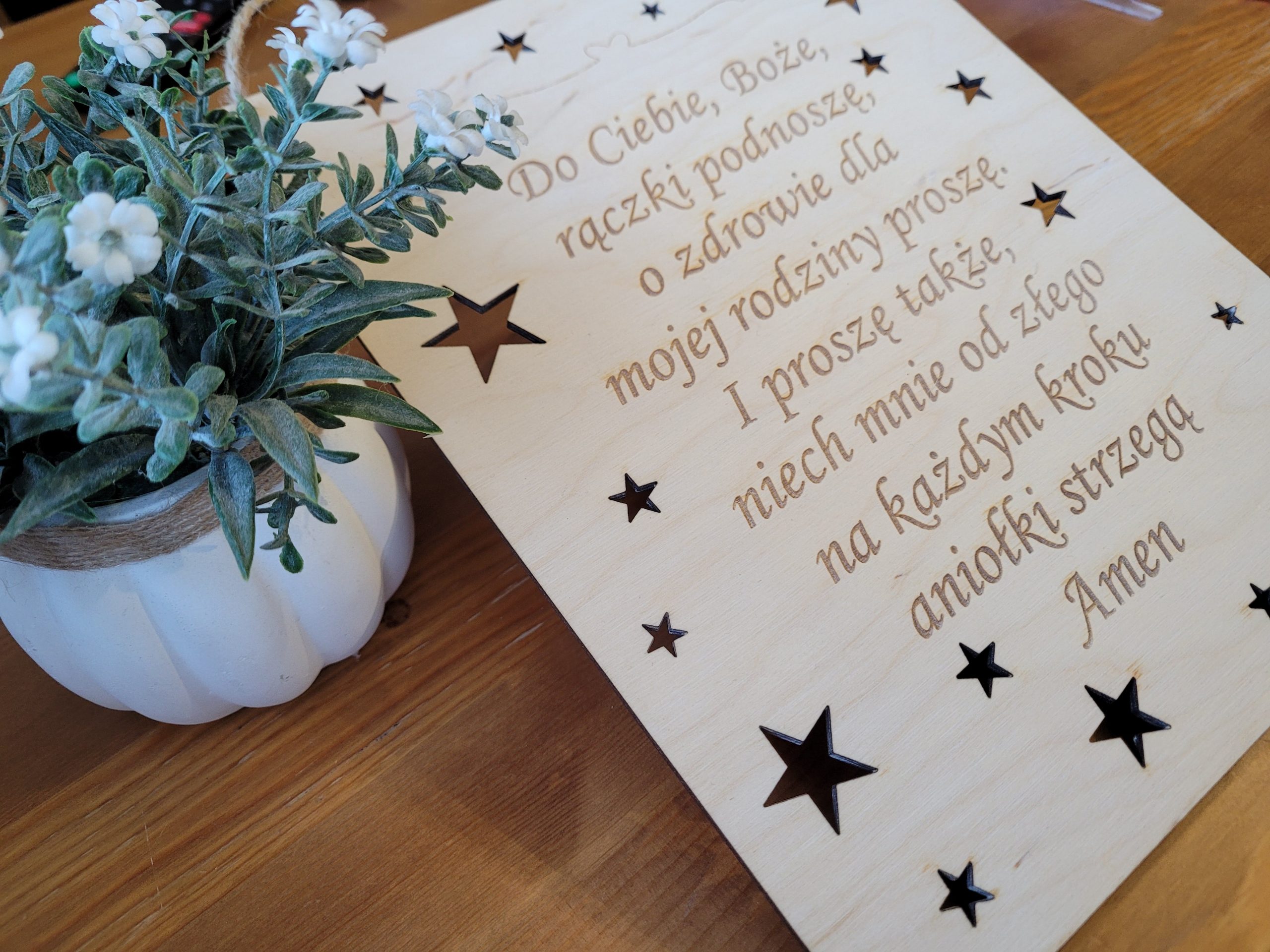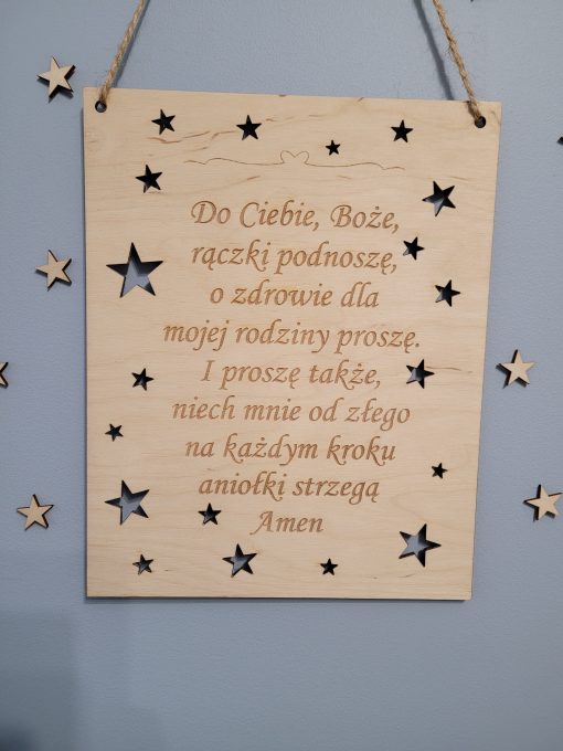 Drewniana tabliczka z modlitwą Do Ciebie Boże, będzie wyjątkowym dodatkiem do pokoju dziecięcego. To idealny pomysł na prezent z okazji Chrztu Św. lub Komunii Św. Proste wykonanie dopasuje się do każdego wnętrza, a trwały materiał sprawi, że pamiątka posłuży na lata.
