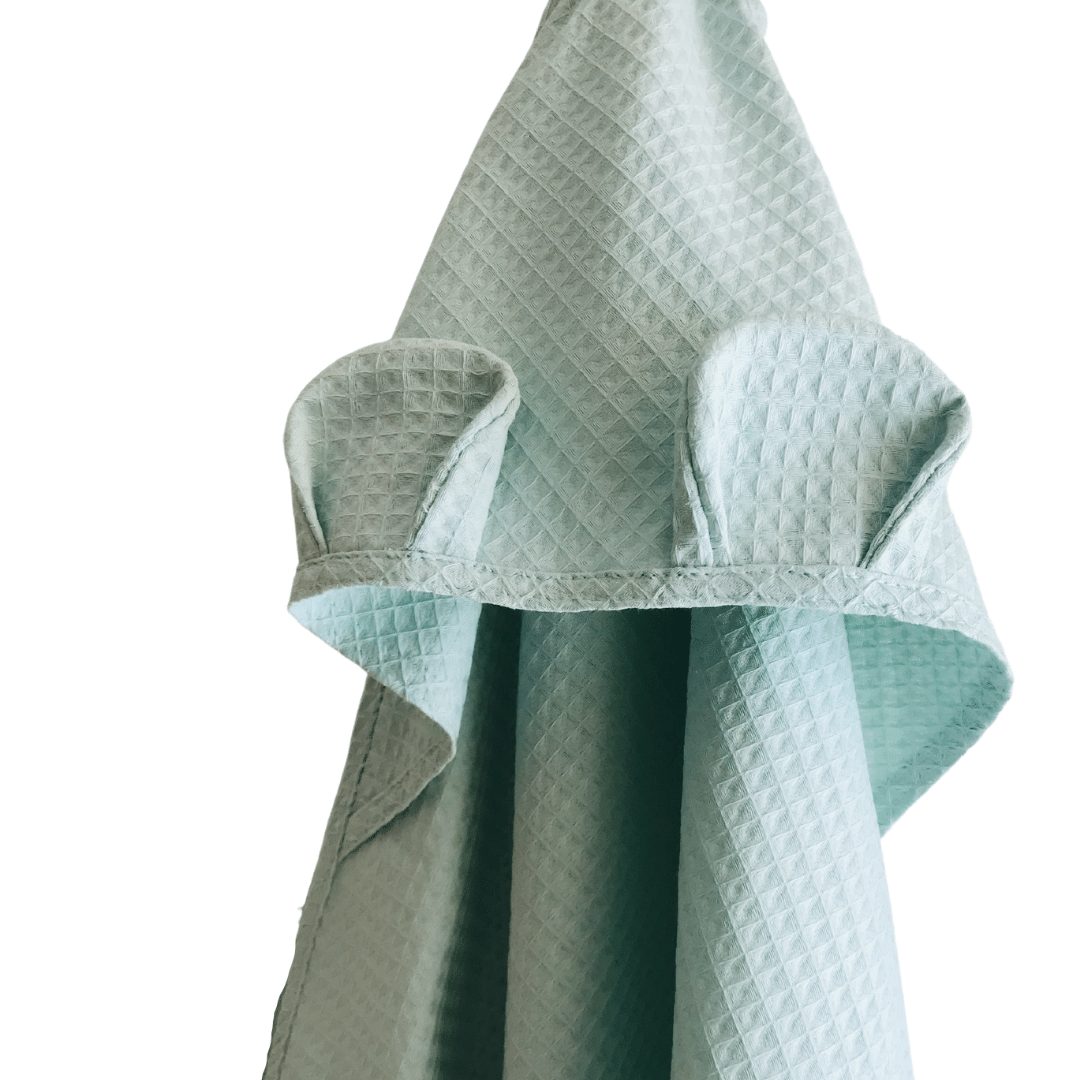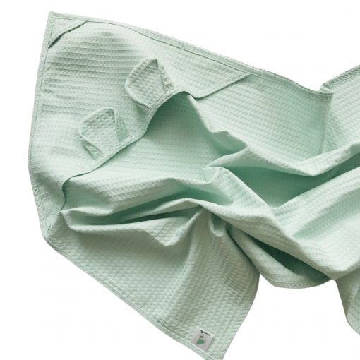 Wafelkowy ręcznik posiada kapturek z uszkami misia. Jest nie tylko uroczy, ale bardzo praktyczny. Dzięki naturalnemu materiałowi oraz swojej strukturze jest bardzo chłonny, ale także szybkoschnący. Ręcznik ma wszyty sznureczek, za który możemy go powiesić na haczyku w łazience.
