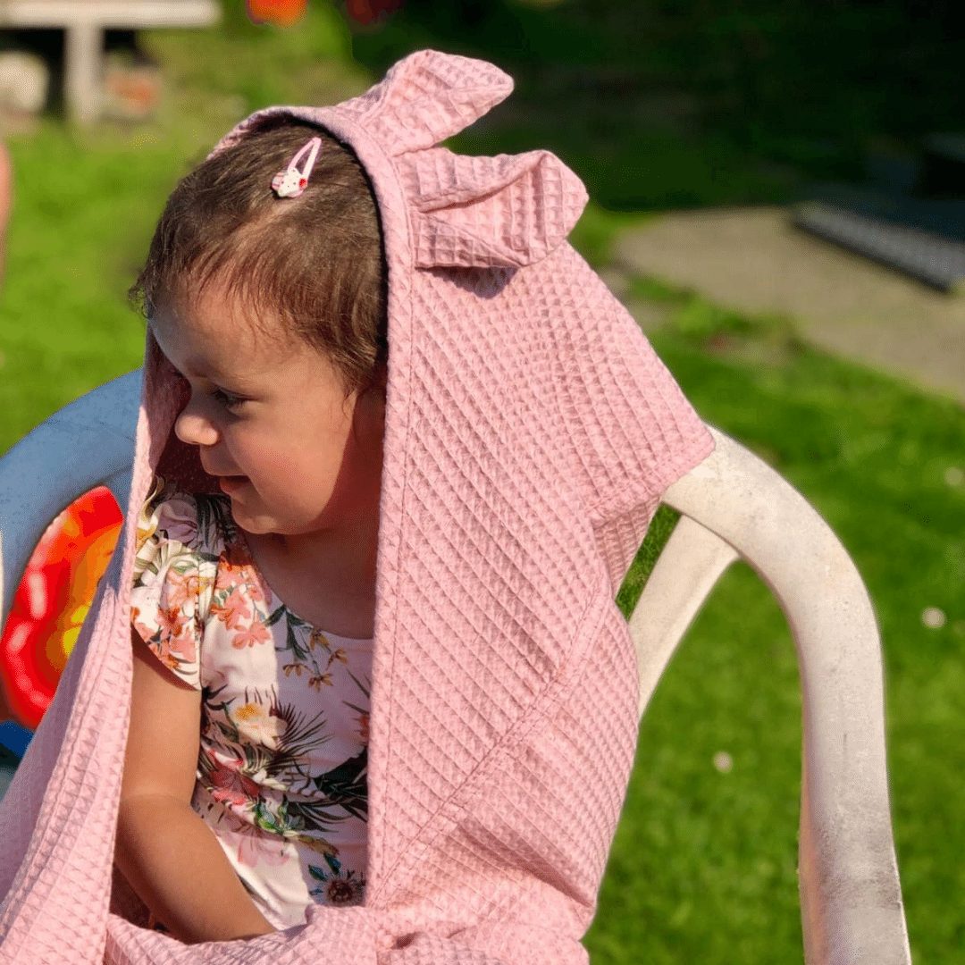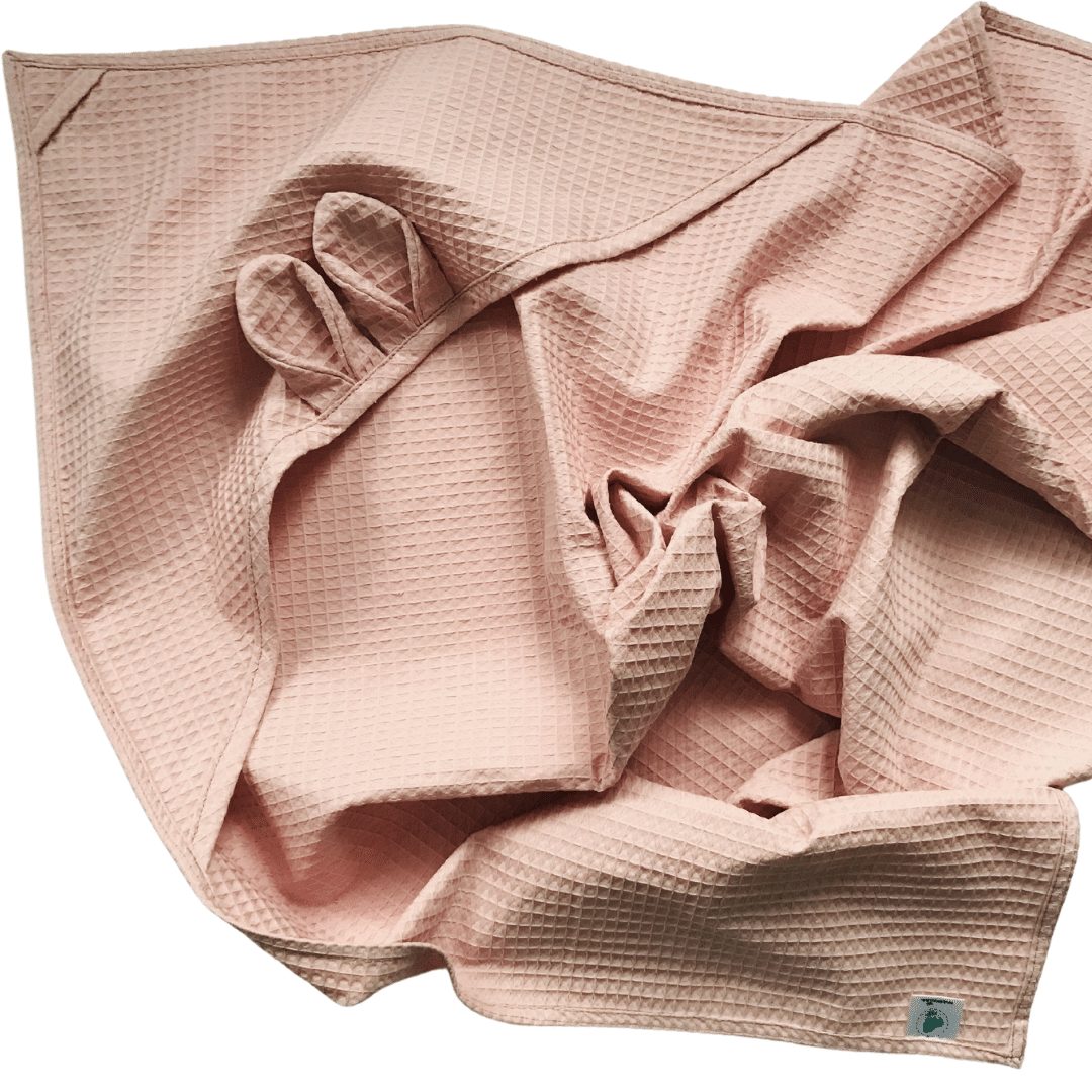 Wafelkowy ręcznik posiada kapturek z uszkami misia. Jest nie tylko uroczy, ale bardzo praktyczny. Dzięki naturalnemu materiałowi oraz swojej strukturze jest bardzo chłonny, ale także szybkoschnący. Ręcznik ma wszyty sznureczek, za który możemy go powiesić na haczyku w łazience.