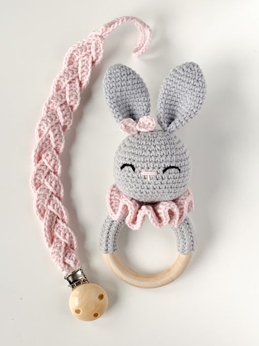 - króliczek oraz zawieszka zostały ręcznie wykonane na szydełku z włóczki bawełniano – akrylowej posiadającej certyfikat Oeko-Tex Standard 100, grzechotka zawiera element grzechoczący oraz wypełniona jest antyalergiczną kulką silikonową a zawieszka zawiera drewniany zaczep.